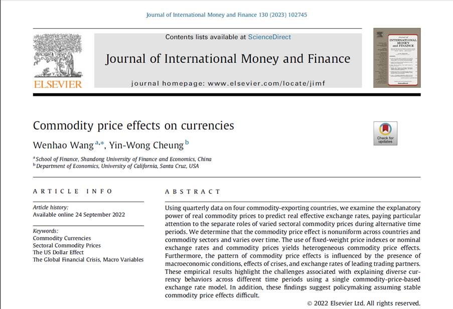 色情网站 教师王文浩作为第一作者与加州大学圣克鲁兹分校教授Yin-Wong Cheung合作的论文“Commodity price effects on currencies”,在期刊Journal of International Money and Finance在线发表(2022年9月)。该期刊为SSCI二区期刊,期刊最新影响因子为2.762,属我校A1类期刊。