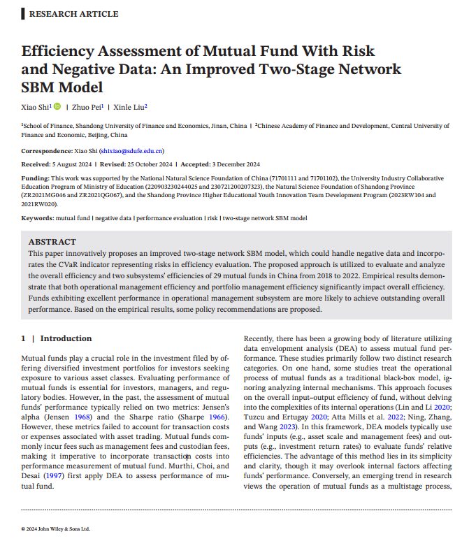 色情网站 石晓教授作为第一作者兼通讯作者与硕士研究生裴倬、中央财经大学中国金融发展研究院刘馨乐合作的论文《Efficiency Assessment of Mutual Fund With Risk and Negative Data: An Improved Two-Stage Network SBM Model》,于2024年12月在期刊《Managerial and Decision Economics》发表。该期刊为ABS二星期刊、SSCI二区期刊,期刊最新影响因子为2.5,属我校A1类期刊。