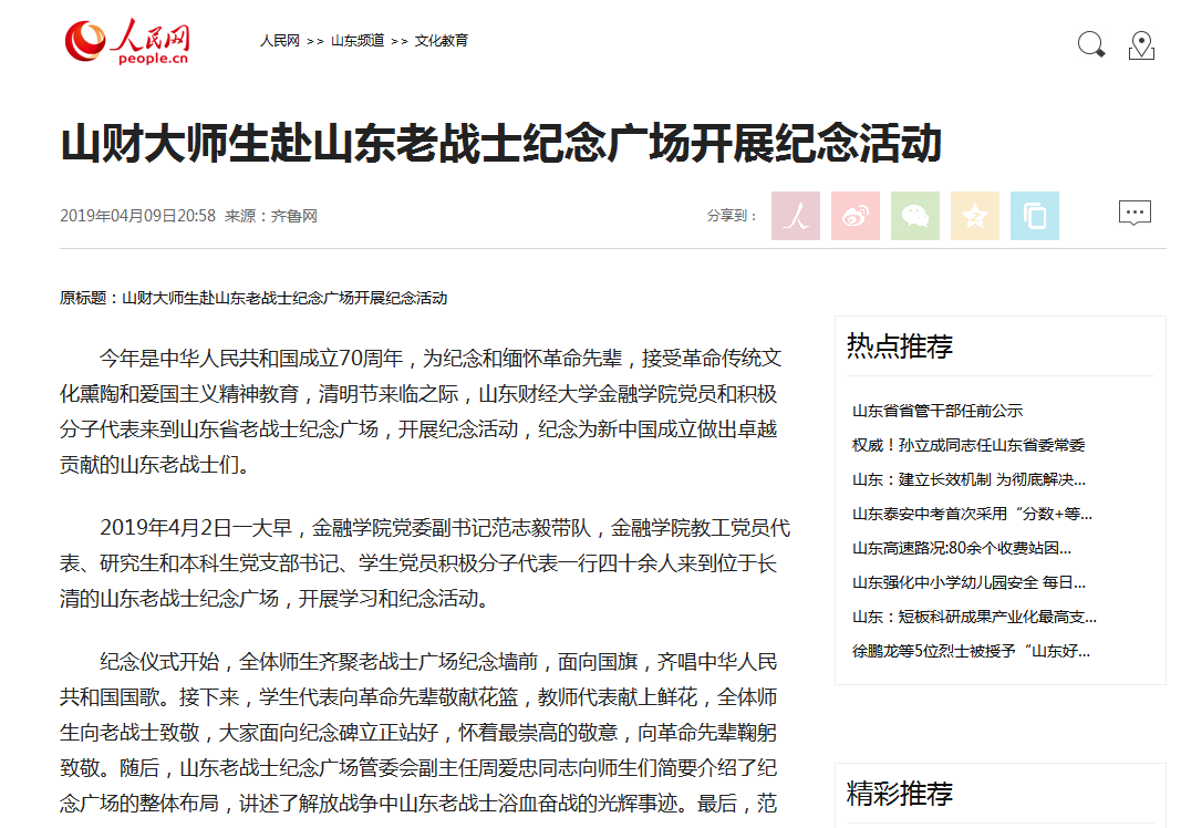 【人民网】【齐鲁壹点】山财大师生赴山东老战士纪念广场开展纪念活动