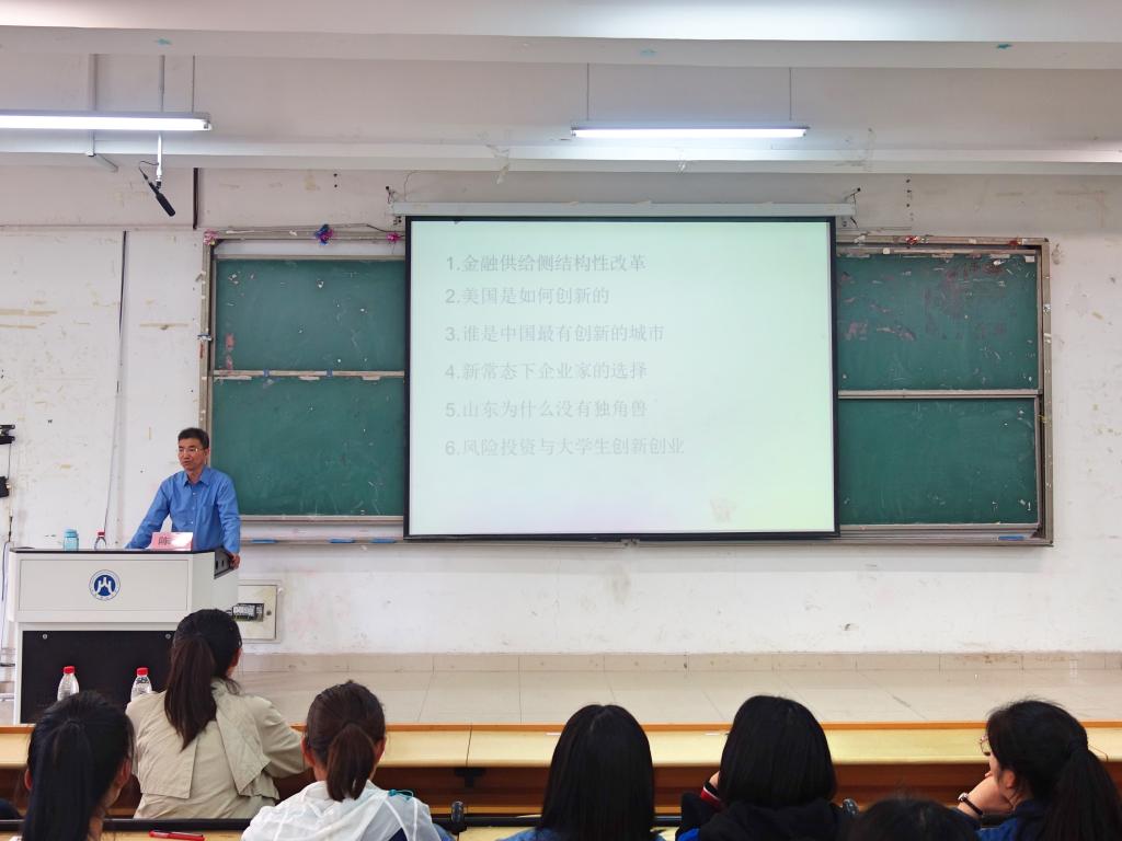 会议伊始,陈教授通过对社会热点问题的剖析,为同学们讲解了供给侧改革的定义,从理论和现实层面说明了发展供给侧改革对当今社会的积极意义。随后,陈教授分析对比了美国和中国创新城市的差异,并着重讲解了山东缺少“独角兽企业”的根本原因,鼓励同学们养成积极思考,勇于创新的好习惯。最后,陈华教授和大家分享了一些商业领军人物的创业经历,鼓舞同学们敢打敢拼,抓住机遇,积极参与大学生创新创业活动,为社会创新事业的发展添砖添瓦。