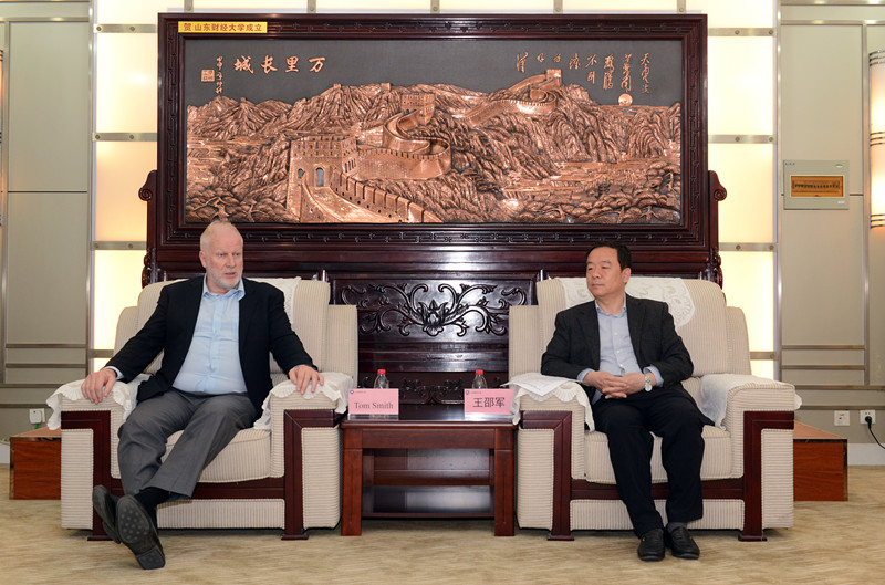 王邵军对Tom Smith教授一行到访表示欢迎。他说,一个月前,我率团访问了澳大利亚麦考瑞大学,双方共同签署了两校合作备忘录,签署了金融硕士双学位项目协议书,共同探讨了本硕3+1+1、硕士1+1+1项目、MBA师资和学员互相交流、游学方式等,并初步达成合作意向。访问期间,麦考瑞大学在教学课程设置、研究生培养模式、学科建设、国际交流合作等方面的主要做法,给我们留下了深刻印象和启示。作为全国在学规模最大的财经类高校,山财大近年来发展势头良好,综合竞争力迈进了全国财经高校前十强,但在人才培养、学科建设、国际合作等方面仍存在一些不足,希望双方以举办2019全球及中国会计与金融国际会议为契机,以金融国际研究中心为平台,进一步密切合作,深度交流,推动双方友好关系稳步发展。