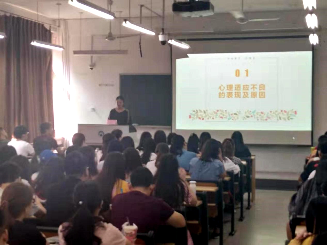 徐洁老师首先用“我从来没有做过”这样一个小游戏,让大家首先认识自己,介绍自己,明白自己的主观想法,并且指出研究生新生入学可能要有诸多不适,这些不适有诸多原因。角色转换、学习习惯改变、人际交往障碍、情感体验与精神紧张等等都可能使我们感动压力。但是我们在新的平台上要好好调适自己,正视压力的同时积极以各种合适的方式去排解,以迎接更加健康充实的研究生生活。