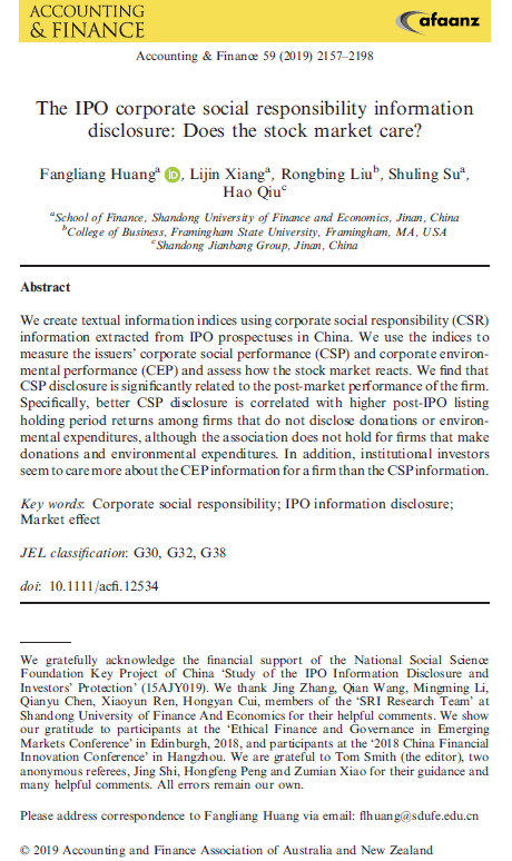 色情网站 黄方亮教授作为第一作者撰写的论文“The IPO Corporate Social Responsibility Information Disclosure: Does the Market Care?”于2019年11月在期刊《Accounting and Finance》发表。该期刊系经济学SSCI二区期刊,属我校A1类期刊。