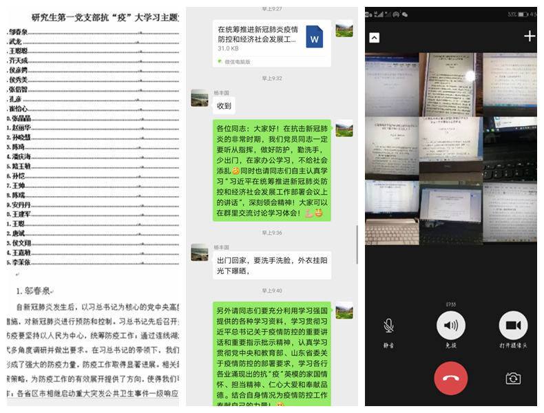研究生第一党支部党员孙恺表示,习总书记关心关爱一线医护人员,让他很感动、很暖心,自己的父亲就是一线的疾控工作者,他们从大年三十开始到现在几乎没有休假,会接触确诊病例,进行流行病调查,是有像他们这样的平凡英雄保护着我们的生命健康,我们更应该响应党和国家的号召,不出门、宅在家,守望相助,共同迎接春暖花开。