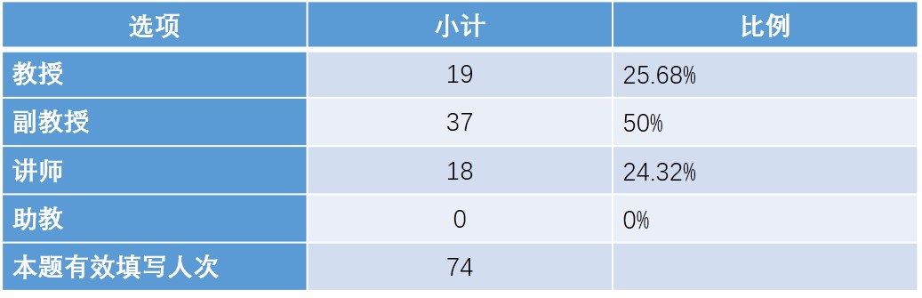 2020年初的新冠肺炎疫情爆发以来,色情网站 根据学校党委教师工作部和教务处的安排,积极组织老师准备线上教学的各种工作。经过近两周的准备,学院在学校的统一安排下,于2020年2月17日正式开展线上教学工作。为了解教师线上教学活动开展情况,及时发现存在的问题并加以改进,学院于2020年3月2日进行了摸底调查。调查对象覆盖了所有74名开课教师的74个教学班,占全部教学班的39.36%,其中专业必修课45门(占比60.81%),专业选修课29门(占比39.19%),实验课12门(占比16.22%),大二(2018级)和大三(2017级)的教学班占比95.95%(图1)。74名任课教师中,副教授37人,占全部教师人数的50%,教授和讲师各占开课教师数的25%左右(表1)。