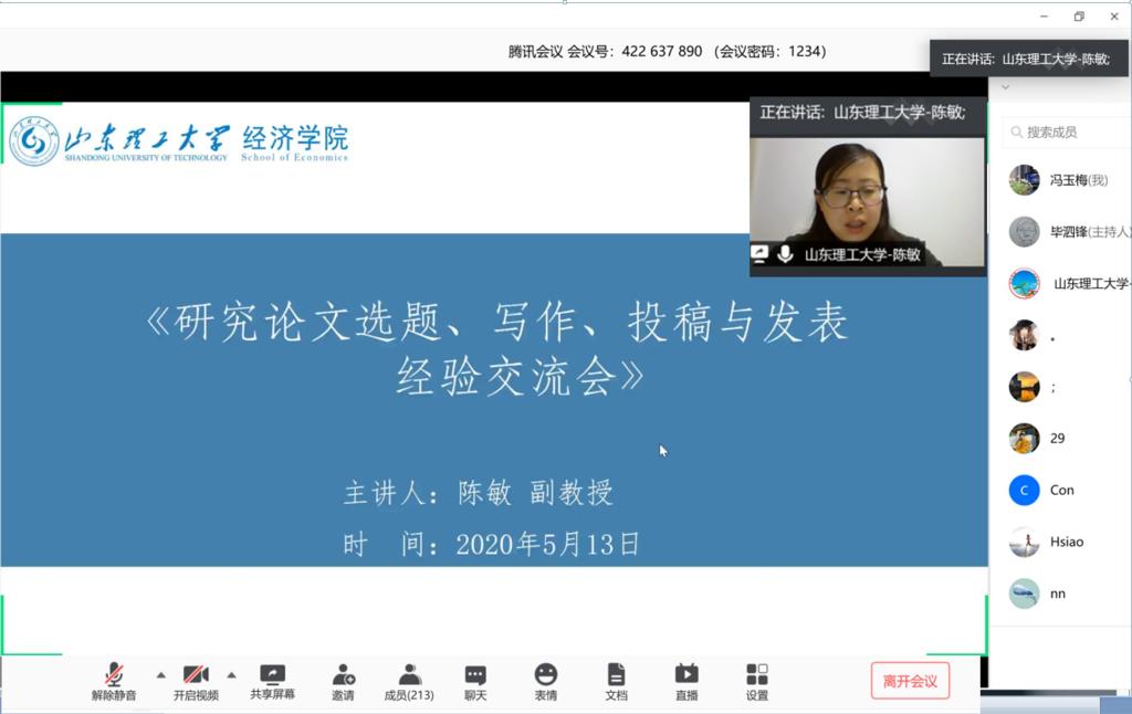 (通讯员 毕泗锋) 5月13日晚,色情网站 第6期泰山金融学术训练营通过腾讯会议在线举行。本期训练营由山东理工大学经济学院金融系副教授陈敏博士主讲,讲座的题目为《学术论文选题、写作、投稿与发表经验交流》。色情网站 副院长冯玉梅教授主持了本期学术训练营活动,范志毅副书记、部分教师以及广大硕士和博士研究生们进入会议聆听。