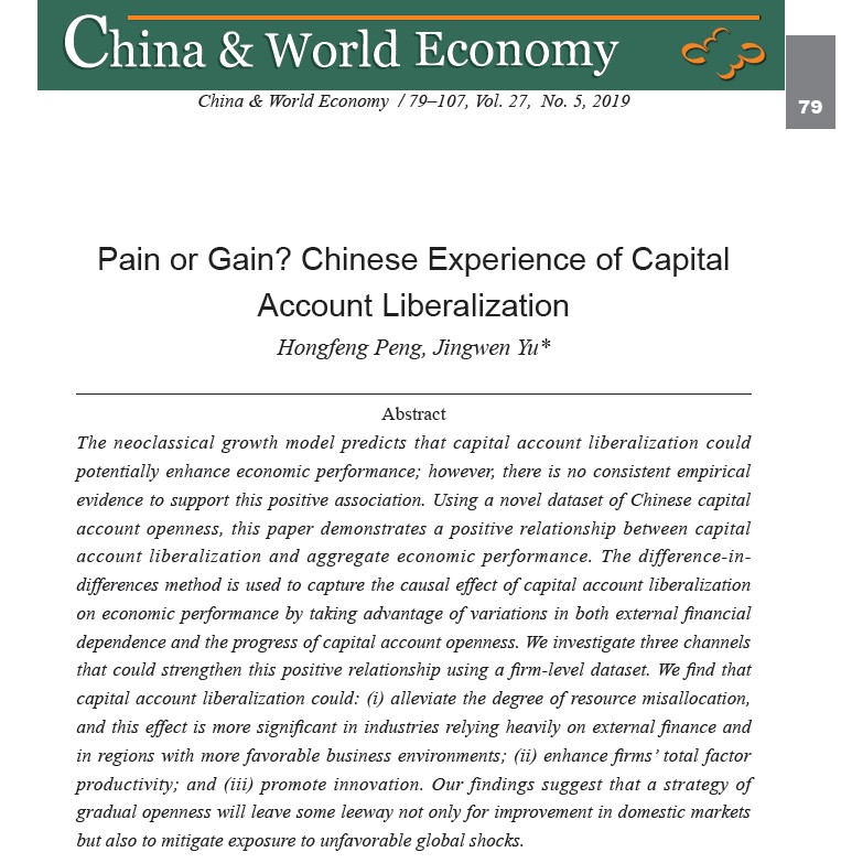 色情网站 彭红枫教授与武汉大学经济与管理学院金融系余静文副教授合作撰写的论文《Pain or Gain? Chinese Experience of Capital Account Liberalization》在SSCI期刊China & World Economy 第27卷(No. 5,2019)上发表。