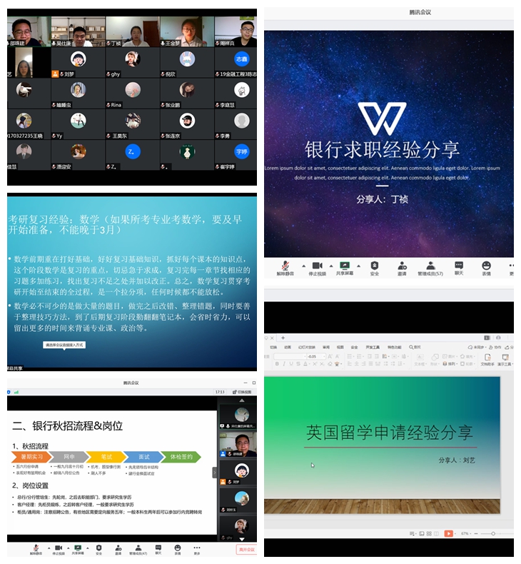 “三全育人”,全员育人。金融学子追梦的路上总有一盏盏明灯为我们照亮。参与分享的优秀毕业生代表不仅为我们带来了学习“干货”,更为师弟师妹提供了前进的方向。特殊时期,优秀毕业生们仍取得了优秀的成绩,为仍在拼搏路上的同学们树立了榜样。