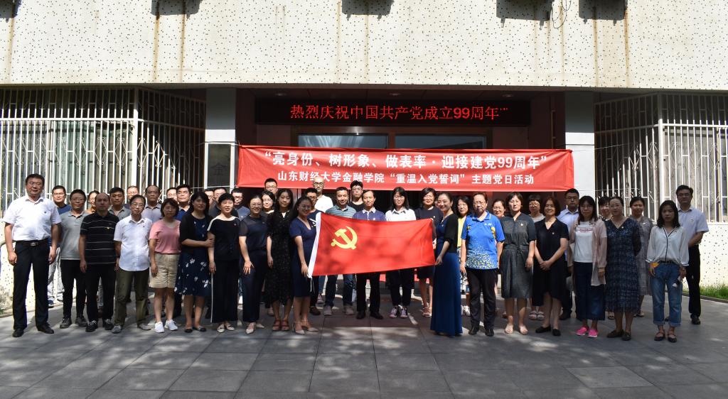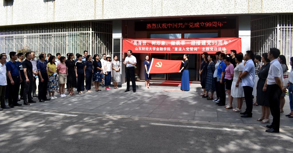 活动伊始,党员干部在金融楼前围绕在党旗下,在党员代表郭夕熙同志带领下,举起右拳,庄严宣誓,重温入党誓词,回想入党之初的庄严承诺,牢记为人民服务的光荣使命,用这种庄严的方式庆祝中国共产党99岁生日。