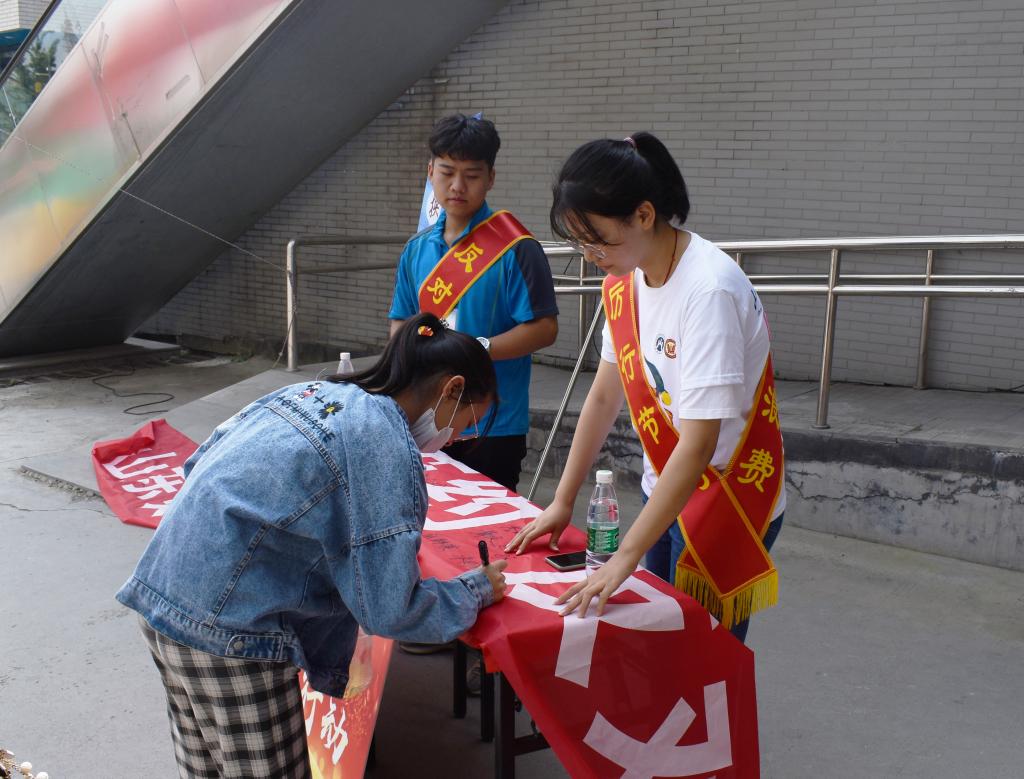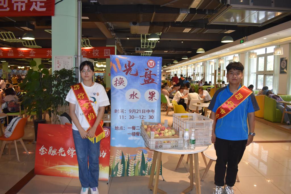 “金融先锋”志愿者团队于各餐厅一楼餐具回收处摆放宣传海报并设置水果发放点,在餐厅门口设置横幅签名处。中午就餐高峰期,活动现场井然有序、忙而不乱,很多师生积极响应号召,来到活动现场展示“光盘”,并在横幅上签字后领取水果。恰逢报到日,大一新生与家长积极参与“光盘”行动,来到活动现场询问进展情况,对活动给予肯定性的评价。一位新生家长表示,虽然现在物质生活比较丰富,但大学生也应该积极响应国家号召,重拾勤俭节约、艰苦朴素的生活作风,不辜负老一辈革命者的奉献。据悉,活动现场累积送出水果1000余斤,收集签名近千个,收到了同学与家长的一致好评。