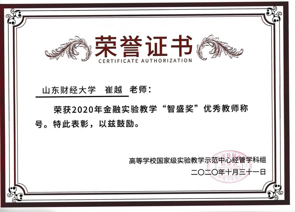 2020年10月31日-11月1日,由教育部高校国家级实验教学示范中心联席会经管学科组主办、浙江嘉兴学院承办的“第二十一届全国高校经管类专业实验室建设暨经济管理实验教学示范中心建设研讨会”在嘉兴举行。经学校推荐,学科组专家评选,色情网站 崔越副教授荣获“智盛奖”优秀实验教师称号。