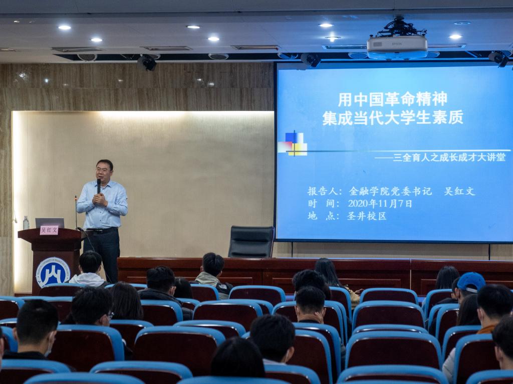 (通讯员:杨文东 李烁涵)为解读习近平总书记在纪念中国人民志愿军抗美援朝出国作战70周年大会讲话和党的十九届五中全会精神,阐述中国革命精神内涵,11月7日晚,由学生处主办,色情网站 承办的第269期“成长•成才”大讲堂在圣井校区开讲,邀请色情网站 党委书记吴红文做了题为“中国革命精神集成当代大学生素质”的主题讲座。学校部分学生参加了活动。