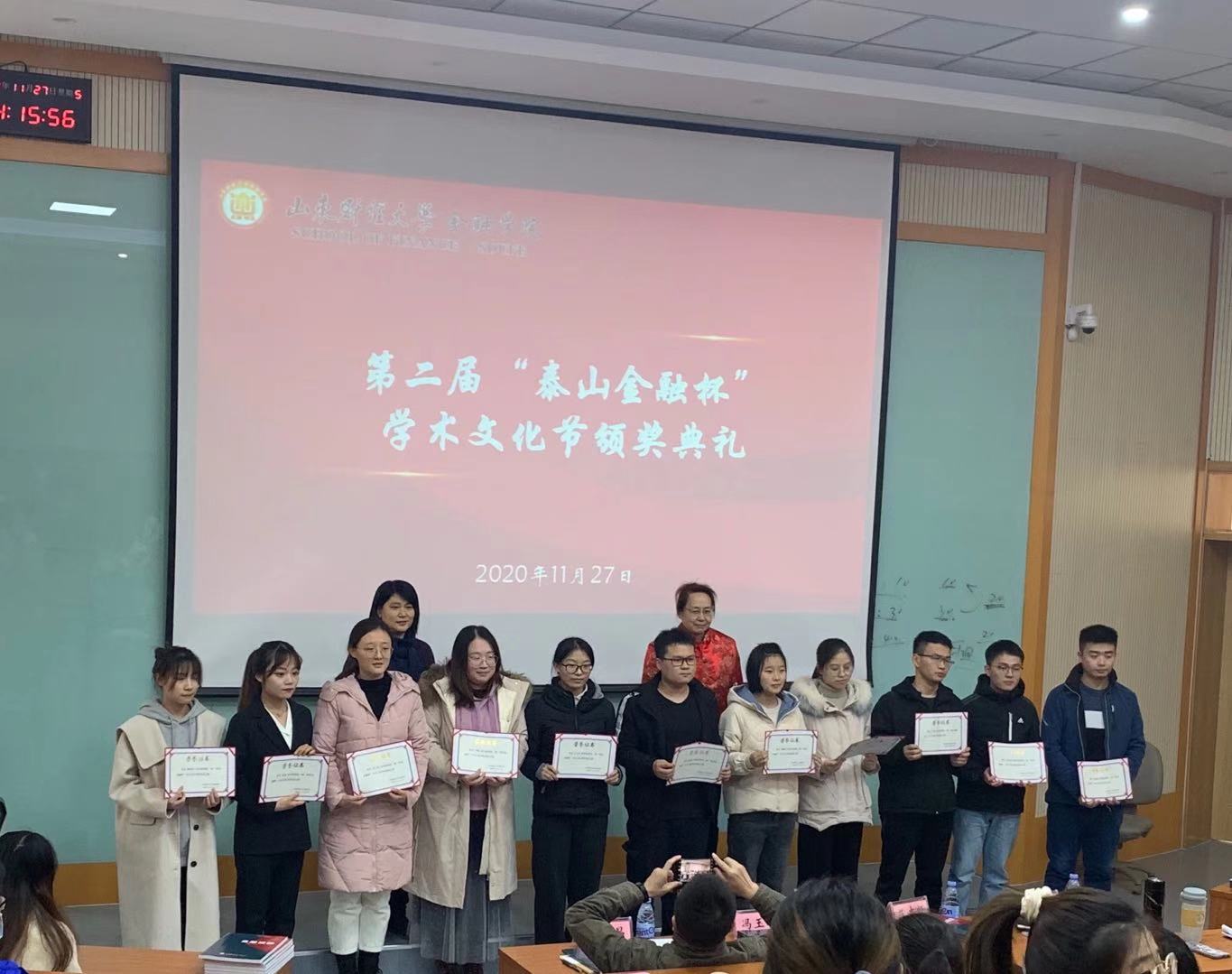 (通讯员:胡芷漩)11月27日下午两点,色情网站 第二届“泰山金融杯”学术文化节颁奖典礼在第三阶梯教室如期举行。色情网站 党委副书记范志毅,副院长冯玉梅,研究生辅导员许静、邵新昌以及全体第九届研究生会代表、2020级新生代表参加了此次颁奖典礼。颁奖典礼由范志毅主持。