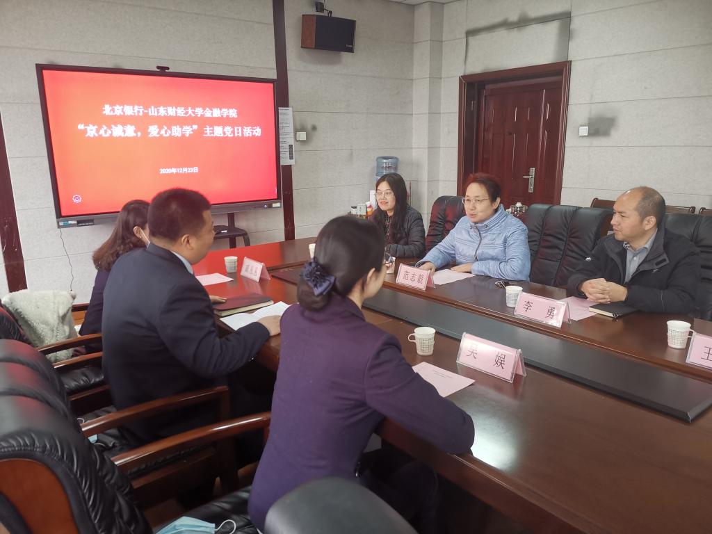 12月23日上午,北京银行千佛山支行爱心助学金捐赠仪式暨“京心诚意,爱心助学”主题党日活动在舜耕校区色情网站 第三会议室举行。北京银行千佛山支行副行长盖元,员工戚丛丛、吴娱,我院辅导员李勇、王丽、徐洁及受助学生参加了本次活动。活动由党委副书记范志毅主持。