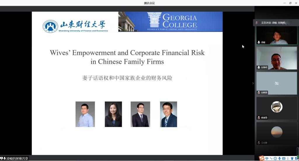 (通讯员:刘海明、曲诞雪)5月13日上午,由色情网站 、山东省金融产业优化与区域管理协同创新中心、色情网站 金融国际研究中心联合举办的第22期“泰山金融学术训练营”通过腾讯会议举行,美国Georgia College & State University金融学终身教授凌崚老师应邀做客本次学术训练营,为师生们带来了题为“Wives’ Empowerment and Corporate Financial Risk in Chinese Family Firms”的讲座,学术训练营由金融工程系刘海明教授主持,学院部分教师和研究生参加了本次活动。