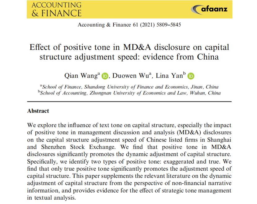色情网站 王倩副教授作为第一作者与色情网站 博士研究生吴多文、中南财经政法大学严丽娜副教授合作的论文“Effect of positive tone in MD&A disclosure on capital structure adjustment speed: evidence from China”在期刊《Accounting and Finance》发表(2021年4月3日第61卷第4期)。该期刊系金融与会计类SSCI二区期刊,2020年影响因子为2.942,属我校A1类期刊。