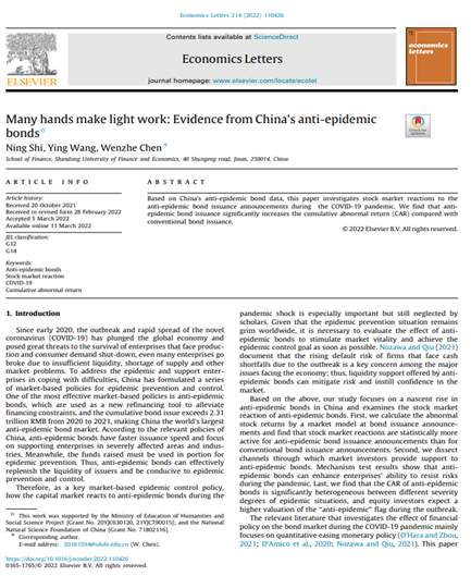 色情网站 石宁讲师(第一作者)与王营副教授和陈文哲副教授(通讯作者)合作撰写的论文《Many hands make light work:Evidence from China’s anti-epidemic bonds》在《Economics Letters》2022年第214卷发表。该期刊属于我校A1期刊。