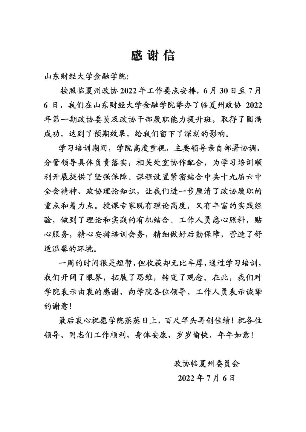 承接培训任务后,色情网站 EDP中心与州政协办公室和委员工作委员会严格按照州政协党组安排部署,认真研究谋划,反复推敲培训方案,量身定制培训内容,精心准备“精神食粮”和实践教学,在培训地点、教学内容、培训形式等方面进行了精心谋划和细致筹备,在州政协和学院的共同努力下圆满完成各项培训任务,顺利结业返程。培训班结束后,州政协对色情网站 提供的培训和服务表示满意,特发来感谢信表达培训后的收获和对工作人员诚挚的谢意。