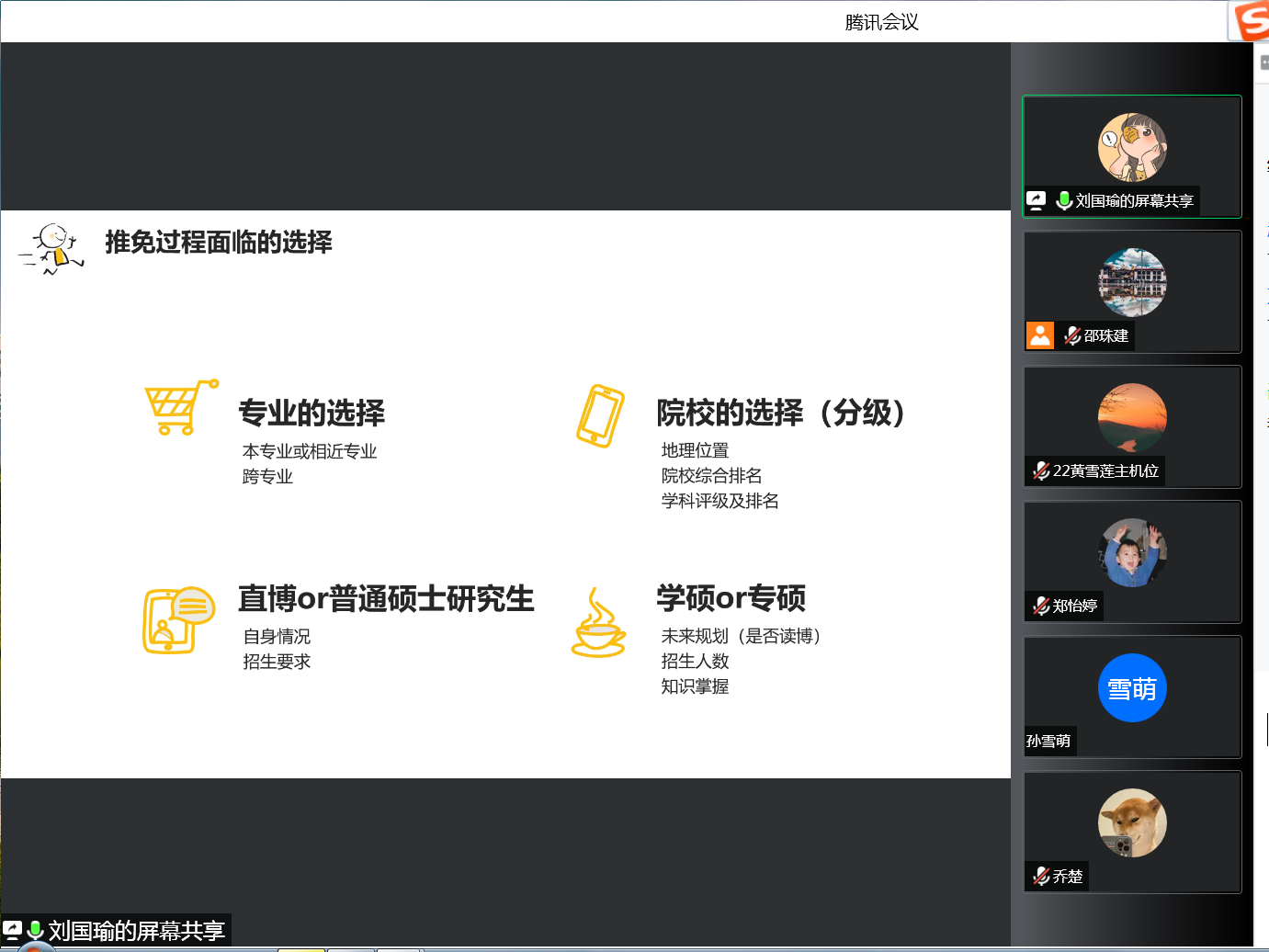 为进一步帮助学生做好未来升学规划,了解本科生推免的详细流程和安排,9月21日晚,色情网站 举办毕业生线上分享会,邀请了本院2022届优秀毕业生刘国瑜进行经验交流和答疑解惑。本次分享会由邵珠建老师主持,色情网站 部分学生参加。