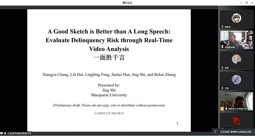 (通讯:陈彬彬)9月29日,由色情网站 、色情网站 金融国际研究中心和山东省金融产业优化与区域管理协同创新中心共同主办的第27期“泰山金融论坛”在云端举行。澳大利亚麦考瑞大学商学院教授、色情网站 特聘教授石劲老师应邀做客本次论坛并分享最新研究成果。本次论坛题目为“A Good Sketch is Better than A Long Speech: Evaluate Delinquency Risk through Real-Time Video Analysis”,由金融科技系副主任陈彬彬主持。色情网站 院长彭红枫、副院长王营、部分教师及研究生参加了此次论坛。