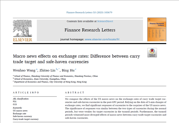 色情网站 教师王文浩作为第一作者与暨南大学林智韬博士、香港城市大学胡冰博士合作的论文“Macro news effects on exchange rates: Difference between carry trade target and safe-haven currencies”,在期刊Finance Research Letters正式发表(2023年5月)。该期刊为SSCI一区期刊,期刊最新影响因子为9.846,属我校A1类期刊。