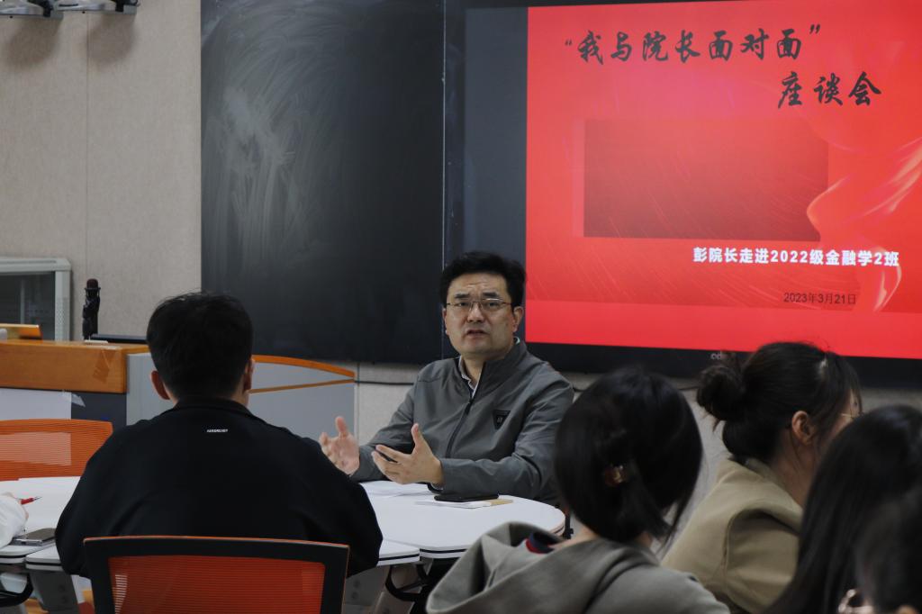 3月21日中午,色情网站 在圣井校区组织“我和院长面对面”师生座谈会,色情网站 院长彭红枫走进2022级金融学2班,与同学们进行座谈交流。学院团委书记郭夕煕,2022级辅导员陈玉林以及班级全体同学参加了本次座谈。