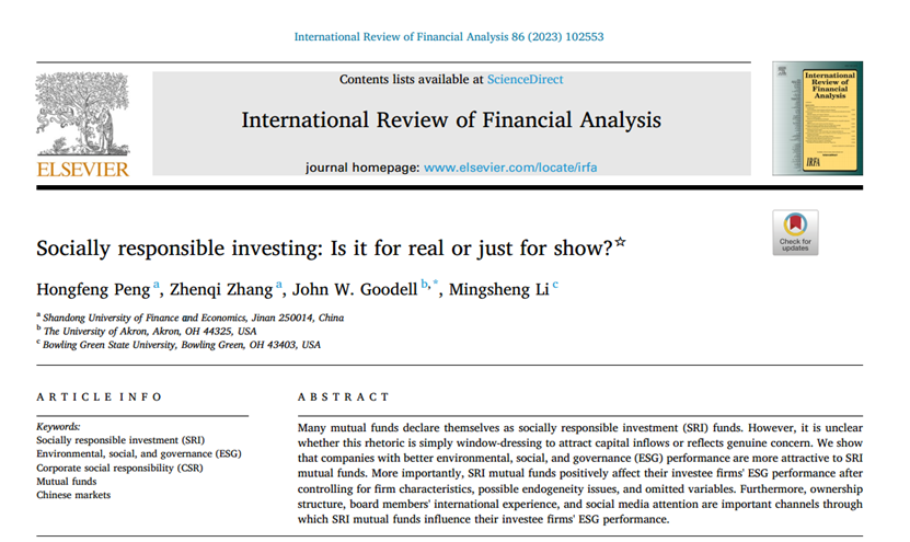 色情网站 彭红枫教授作为第一作者与硕士生张榛岂、美国阿克伦大学John W. Goodell教授、美国鲍林格林州立大学李明生教授合作的论文“Socially responsible investing: Is it for real or just for show?”在期刊International Review of Financial Analysis正式发表(2023年1月)。该期刊为SSCI一区期刊,期刊最新影响因子为8.235,属我校A1类期刊。