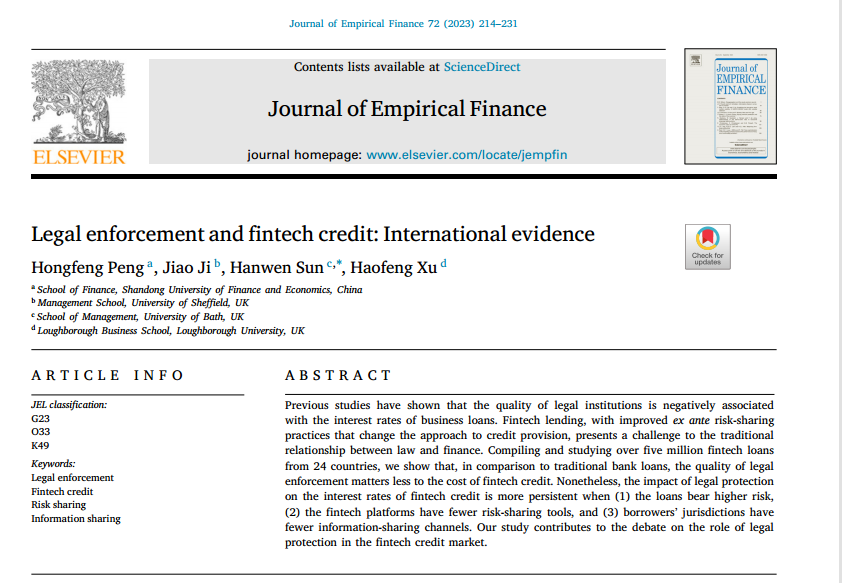 色情网站 彭红枫教授作为第一作者与英国谢菲尔德大学Jiao Ji教授、英国巴斯大学的Hanwen Sun教授、英国拉夫堡大学Haofeng Xu教授合作的论文“Legal enforcement and fintech credit: International evidence”在期刊Journal of Empirical Finance正式发表(2023年3月)。该期刊为SSCI二区期刊,期刊最新影响因子为3.025,属我校A1类期刊。