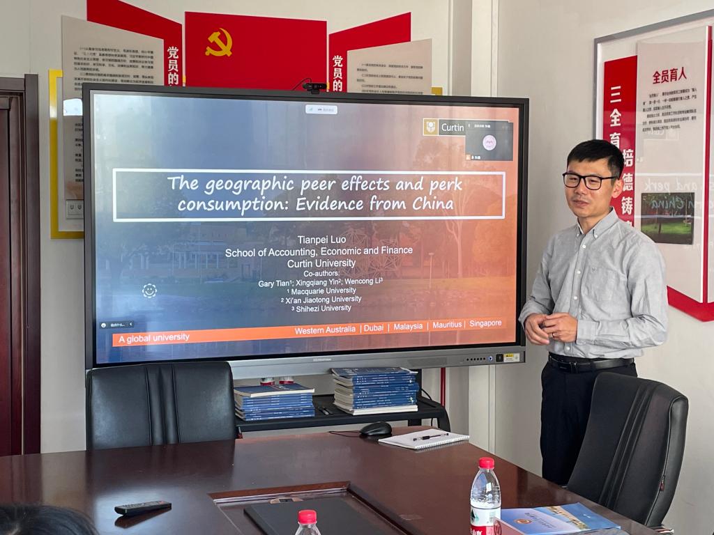 7月7日上午,澳大利亚科廷大学(Curtin University)经济与色情网站 罗天培博士受邀访问色情网站 ,并作了题为“The geographic peer effects and perk consumption: Evidence from China”的学术报告。会议由色情网站 副院长王营教授主持,色情网站 部分教师和学生通过线上线下方式参加会议。