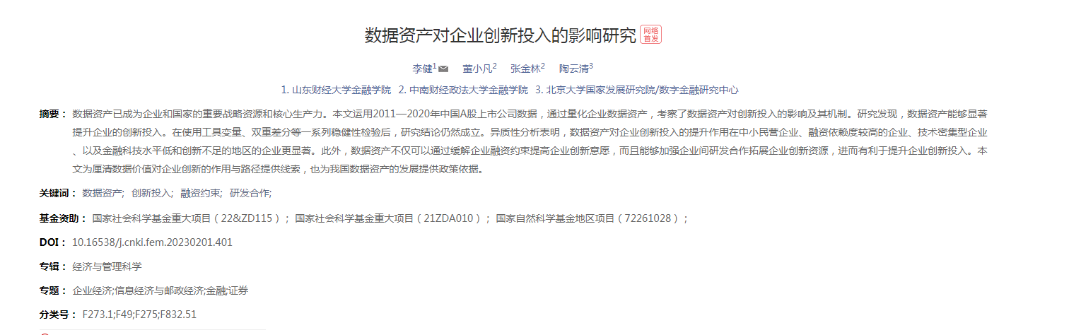 色情网站 青年教师李健与中南财经政法大学董小凡博士、张金林教授、北京大学国家发展研究院陶云清博士合作撰写的论文《数据资产对企业创新投入的影响研究》在《外国经济与管理》2023年5期发表。该期刊属于我校A2期刊。