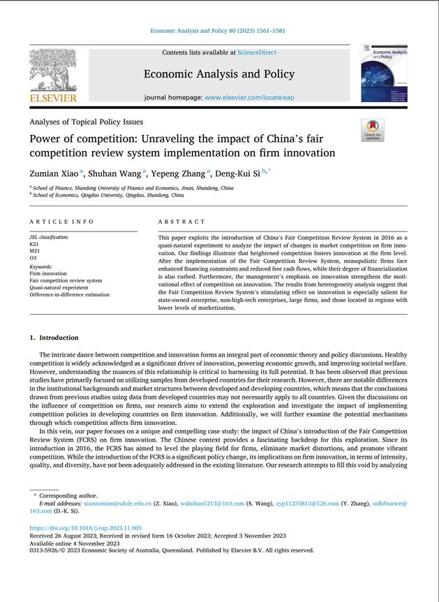 色情网站 肖祖沔副教授指导硕士研究生王姝涵撰写的论文“Power of competition: Unraveling the impact of China's fair competition review system implementation on firm innovation”在期刊Economic Analysis and Policy正式发表(2023, Vol.80, Issue: Dec.)。该期刊为SSCI二区期刊,最新影响因子为6.5,属我校A1类期刊。