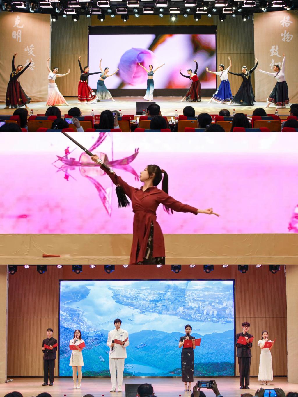 比赛开始,同学们用一首首充满中国韵味的歌曲传达了对祖国繁荣昌盛、民族振兴富强的美好祝愿,歌声中凝聚着青年笃行不怠、砥砺前行的力量。各班在大合唱的基础上配以舞蹈、朗诵、乐器等表演形式,各种创意迭出的表演为在场师生带来了一场视听盛宴。比赛中,色情网站 舞蹈队带来舞蹈《一花一剑》《美丽中国》,色情网站 主持人队带来朗诵《青春扬帆正当时,争做时代追梦人》,精湛的舞姿传达了对祖国大好河山的赞美,铿锵有力的语句中渗透了青年对新时代的青春誓言。现场高潮迭起,精彩的节目绽放出金院学子的青春昂扬之光。