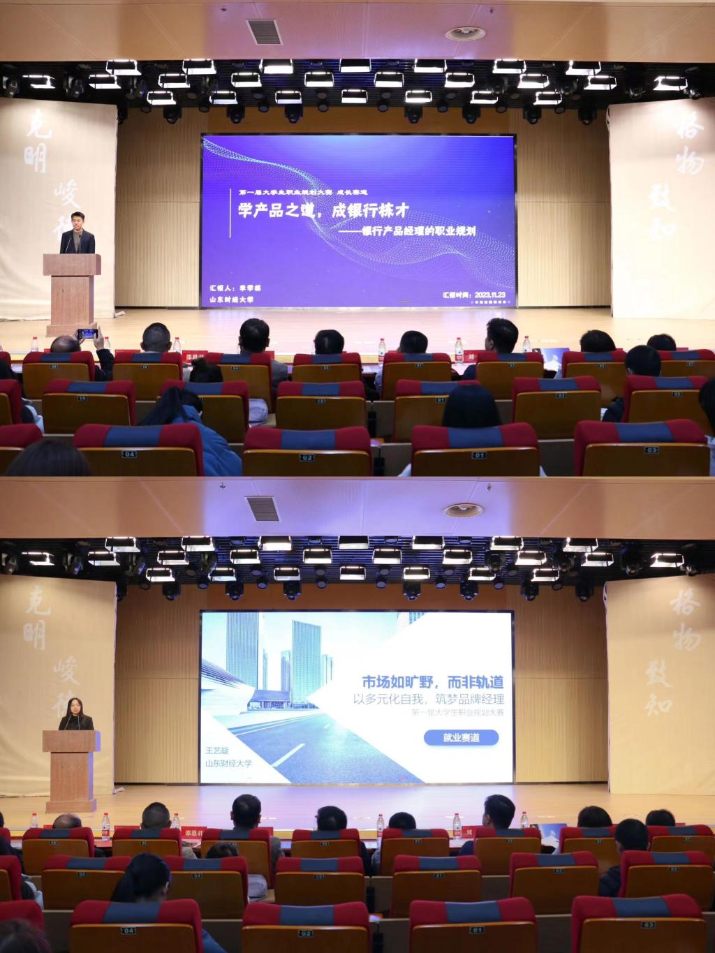 首届职业规划大赛是本次职业能力素质拓展月系列活动的新增亮点,李学栋和王艺璇作为成长赛道和就业赛道的优秀选手,分别就职业目标、计划制定、行动成果和评估调整等方面,现场进行了职业规划大赛的优秀作品展示。