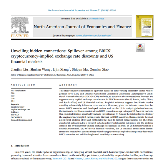 色情网站 刘建建博士后与色情网站 硕士王姝涵、向丽锦副教授、马世群博士、肖祖沔副教授合作撰写的论文《Unveiling hidden connections: Spillover among BRICS’cryptocurrency- implied exchange rate discounts and US financial markets》在《North American Journal of Economics and Finance》2024年第1期发表。该期刊属于我校A1期刊。