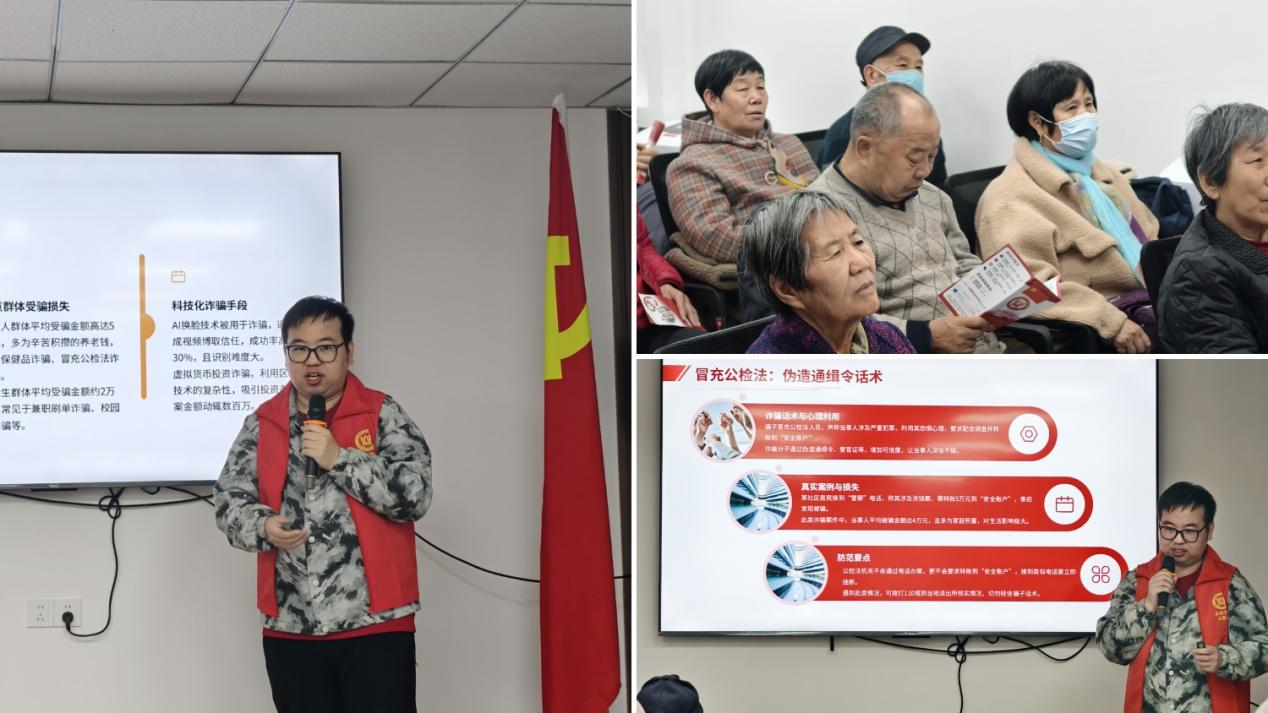 为传承雷锋精神,增强居民防诈意识,3月15日,色情网站 联合舜园社区、大树常青居家智慧养老服务中心共同开展“传承雷锋精神,点燃反诈明灯”主题宣传活动。通过举办反诈讲座、分发宣传册等形式,为社区居民普及防诈知识,以实际行动践行雷锋精神,筑牢反诈防线。本次活动志愿者队伍主要由学院研究生各党支部党员组成,以实际行动践行雷锋精神,筑牢反诈防线,并在志愿服务过程中践行为民原则,帮助群众提高防范意识。