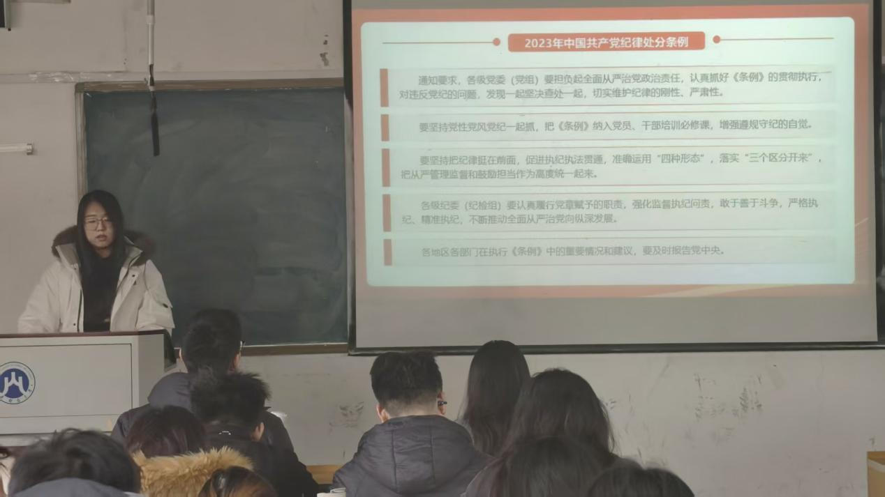紧接着,“青语新声”研究生理论学习宣讲团成员洪婷婷围绕《中国共产党纪律处分条例》进行深度解读。她结合党员日常工作与学习的常见情境,深入解析了违纪行为的认定依据及相应处分结果,精准聚焦新发展党员在思想认知与行为边界方面可能存在的困惑。针对政治攀附、网络言论失范、学术不端、铺张浪费等新增违纪情形,她展开着重解读,通过将具体条款与实践要求紧密结合的方式,助力预备党员清晰界定行为边界,进一步强化遵规守纪的思想自觉与行动自觉。