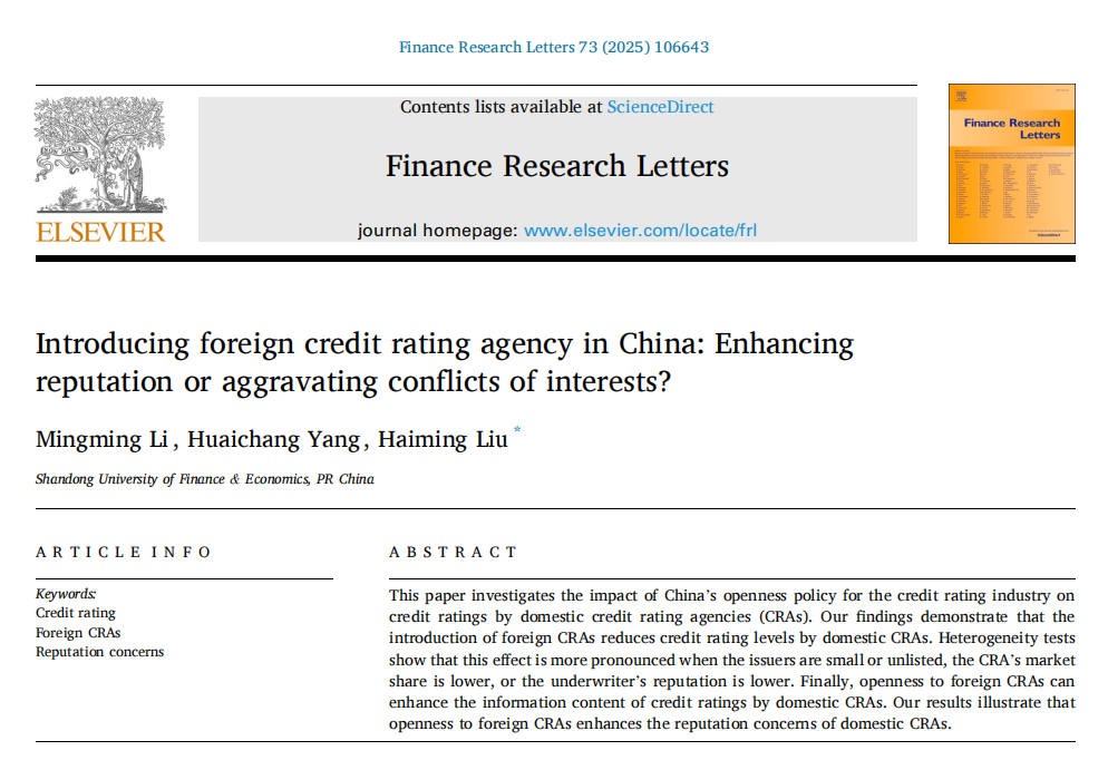 色情网站 副教授李明明作为第一作者与硕士研究生杨怀畅、色情网站 金融发展研究院刘海明教授合作撰写的论文《Introducing foreign credit rating agency in China: Enhancing reputation or aggravating conflicts of interests?》在《Finance Research Letters》2025年第73卷(Volume 73, March 2025, 106643)发表。该期刊为SSCI一区期刊,期刊影响因子为7.4。