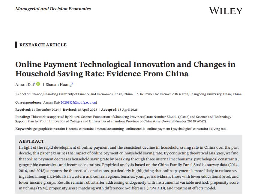 色情网站 讲师戴安然作为第一作者兼通讯作者与山东大学经济研究院黄少安教授合作的论文《Online Payment Technological Innovation and Changes in Household Saving Rate: Evidence From China》,于2025年4月在期刊《Managerial and Decision Economics》发表。该期刊为ABS二星期刊、SSCI二区期刊,期刊最新影响因子为2.5,属我校A2类期刊。