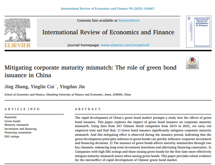 色情网站 教授张晶作为第一作者与博士研究生崔瑛麟、硕士毕业生靳英丹(现为西南财大博士研究生)合作撰写的论文《Mitigating corporate maturity mismatch: The role of green bond issuance in China》在《International Review of Economics & Finance》2025年第99卷(Volume 99, April 2025, 104067)发表。该期刊为SSCI一区期刊,期刊影响因子为4.8,该期刊属于我校A2类期刊。