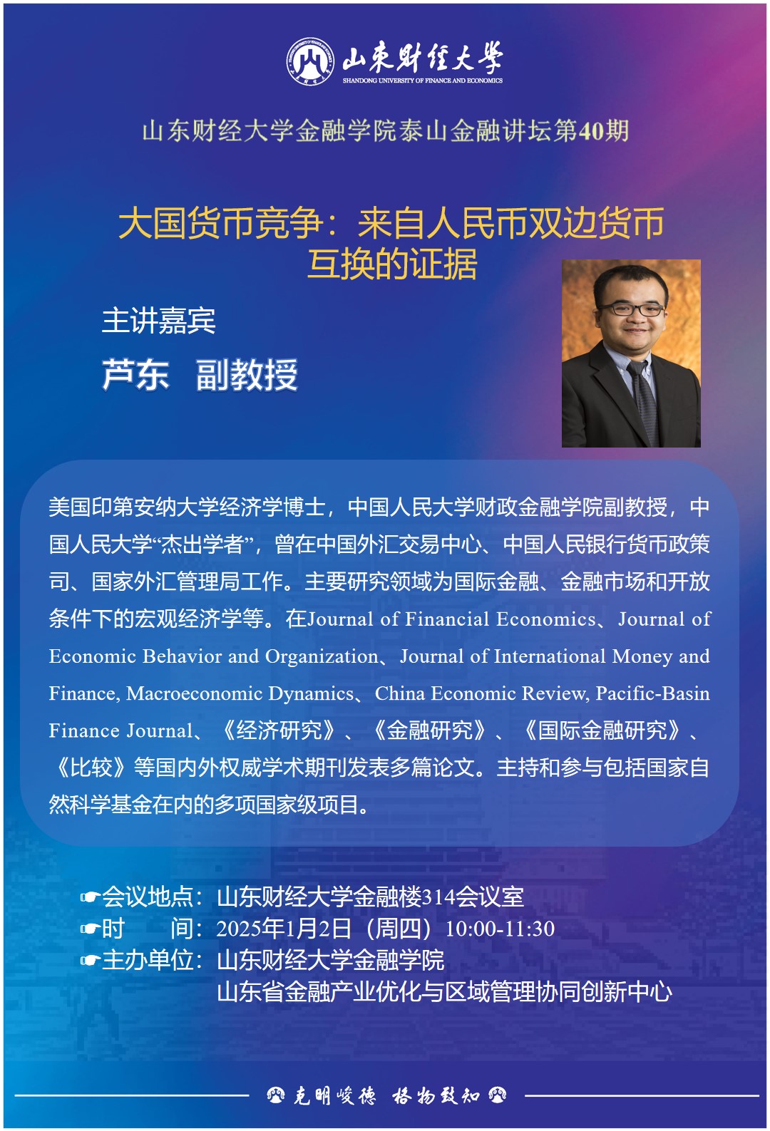 芦东,美国印第安纳大学经济学博士,中国人民大学财政色情网站 副教授,中国人民大学“杰出学者”,曾在中国外汇交易中心、中国人民银行货币政策司、国家外汇管理局工作。主要研究领域为国际金融、金融市场和开放条件下的宏观经济学等。在Journal of Financial Economics、Journal of Economic Behavior and Organization、Journal of International Money and Finance, Macroeconomic Dynamics、China Economic Review, Pacific-Basin Finance Journal、《经济研究》、《金融研究》、《国际金融研究》、《比较》等国内外权威学术期刊发表多篇论文。主持和参与包括国家自然科学基金在内的多项国家级项目。