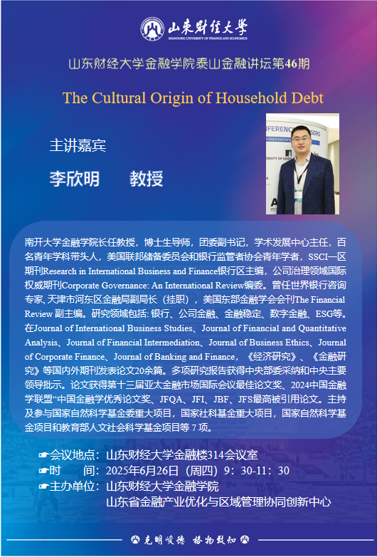 李欣明,南开大学色情网站 长任教授,博士生导师,团委副书记,学术发展中心主任,百名青年学科带头人,美国联邦储备委员会和银行监管者协会青年学者,SSCI一区期刊Research in International Business and Finance银行区主编,公司治理领域国际权威期刊Corporate Governance: An International Review编委。曾任世界银行咨询专家, 天津市河东区金融局副局长(挂职),美国东部金融学会会刊The Financial Review 副主编。研究领域包括: 银行、公司金融、金融稳定、数字金融、ESG等。在Journal of International Business Studies、Journal of Financial and Quantitative Analysis、Journal of Financial Intermediation、Journal of Business Ethics、Journal of Corporate Finance、Journal of Banking and Finance,《经济研究》、《金融研究》等国内外期刊发表论文20余篇。多项研究报告获得中央部委采纳和中央主要领导批示。论文获得第十三届亚太金融市场国际会议最佳论文奖、2024中国金融学联盟“中国金融学优秀论文奖、JFQA、JFI、JBF、JFS最高被引用论文。主持及参与国家自然科学基金委重大项目,国家社科基金重大项目,国家自然科学基金项目和教育部人文社会科学基金项目等 7 项。