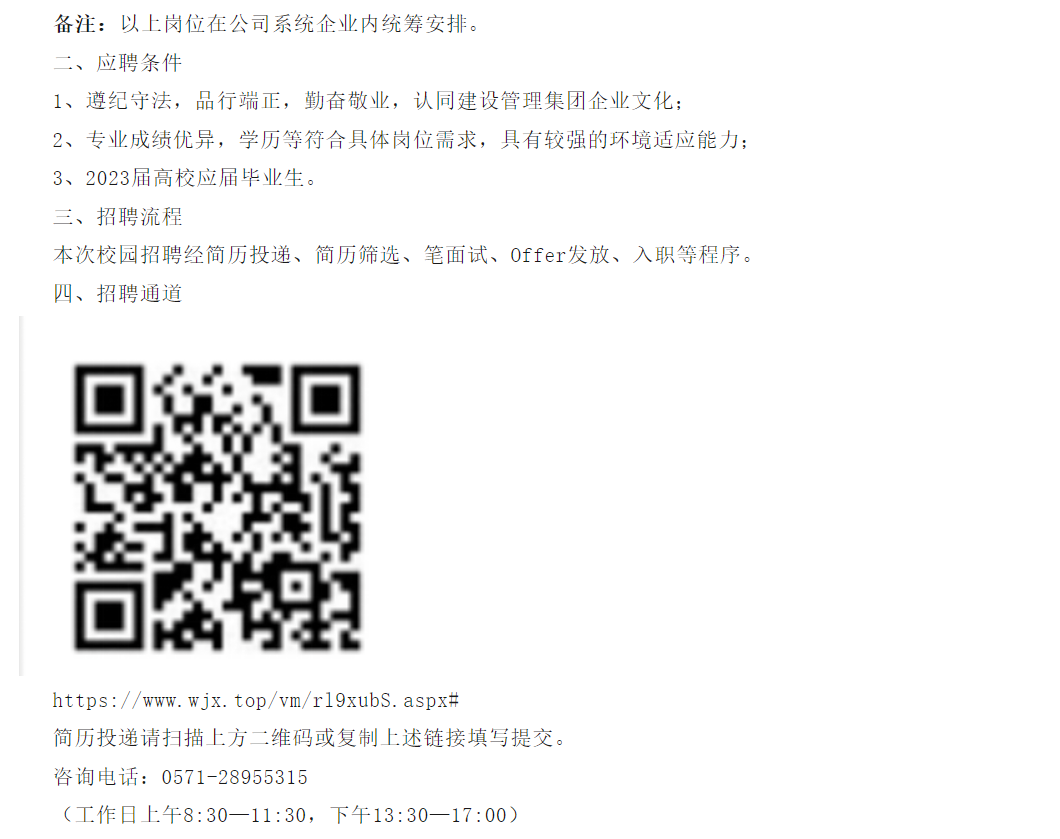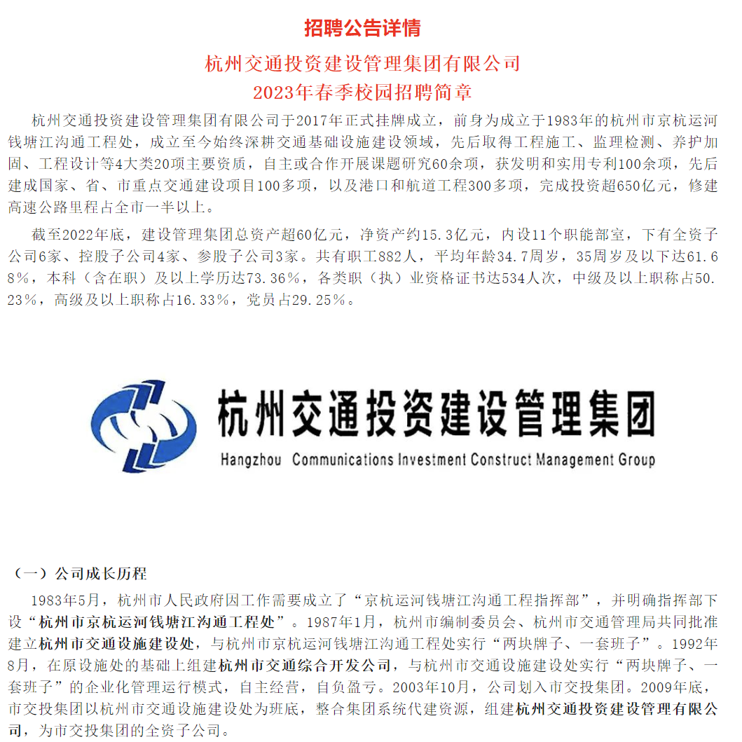 杭州交通投资建设管理集团有限公司 2023年春季校园招聘简章