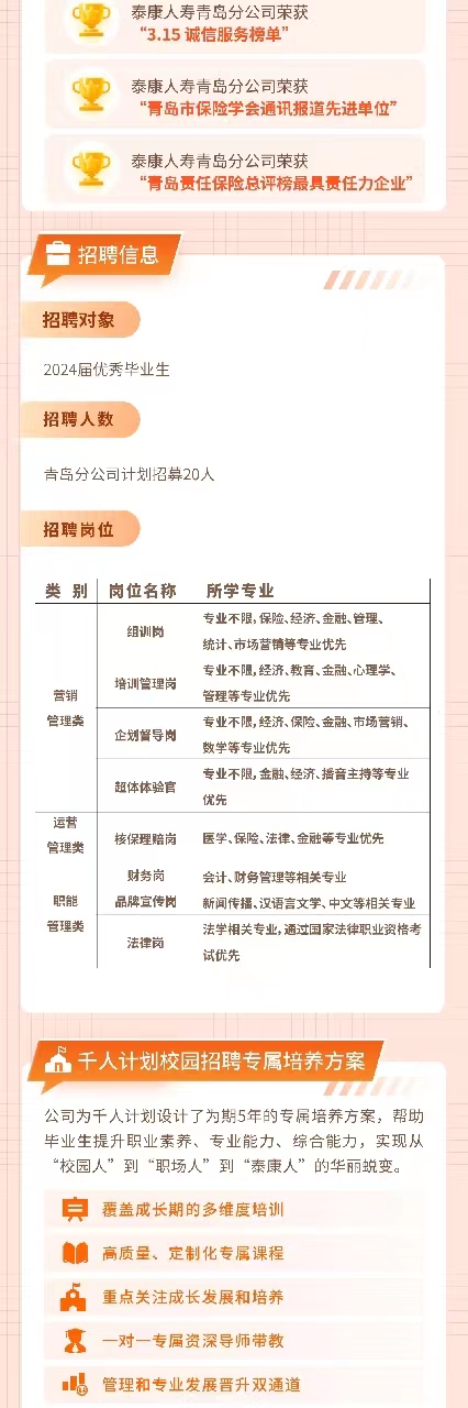 泰康人寿青岛分公司2024年校园招聘已经启动