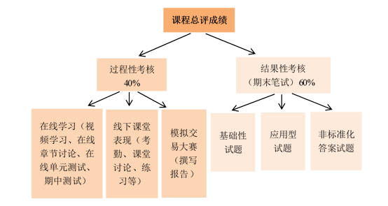 近年来,课程不断完善全过程学业评价体系,从知识性、结果性评价方式向综合性、过程性评价方式延伸,构建多元化评价体系,强调评价维度的多元化、评价方法的多元化和评价主体的多元化。基于这一总体思路,将学业评价的成绩分为四个部分,即在线学习、课堂表现、模拟交易大赛和期末考试,其中在线学习、课堂表现和模拟交易大赛为过程性考核,期末考试为结果性考核。过程性考核占总成绩的40%,结果性考核占总成绩的60%。